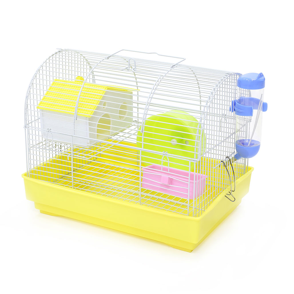 В комплекте: кормушка, внешняя поилка, металлический этаж, лесенка, домик, беговое колесо, ручка для переноски.