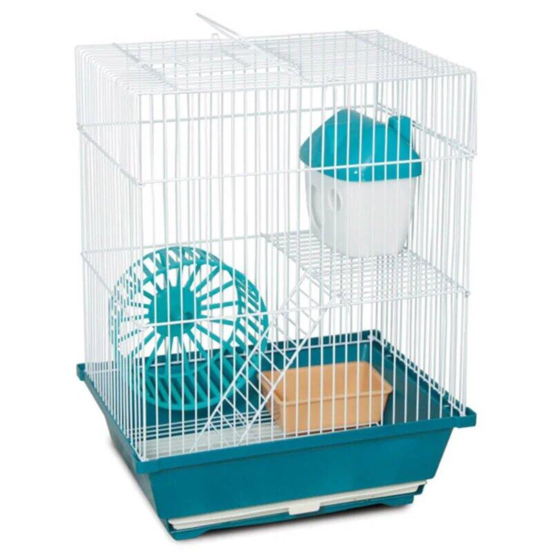 Двухэтажная клетка прямоугольной формы с вертикальными прутьями подходит для мелких домашних животных вроде крыс, мышей и хомяков. В комплектацию изделия также входят: пластиковая миска, уютный домик и беговое колесо. Кроме того, клетка оборудована удобной ручкой на крыше, облегчающей процесс переноски изделия.