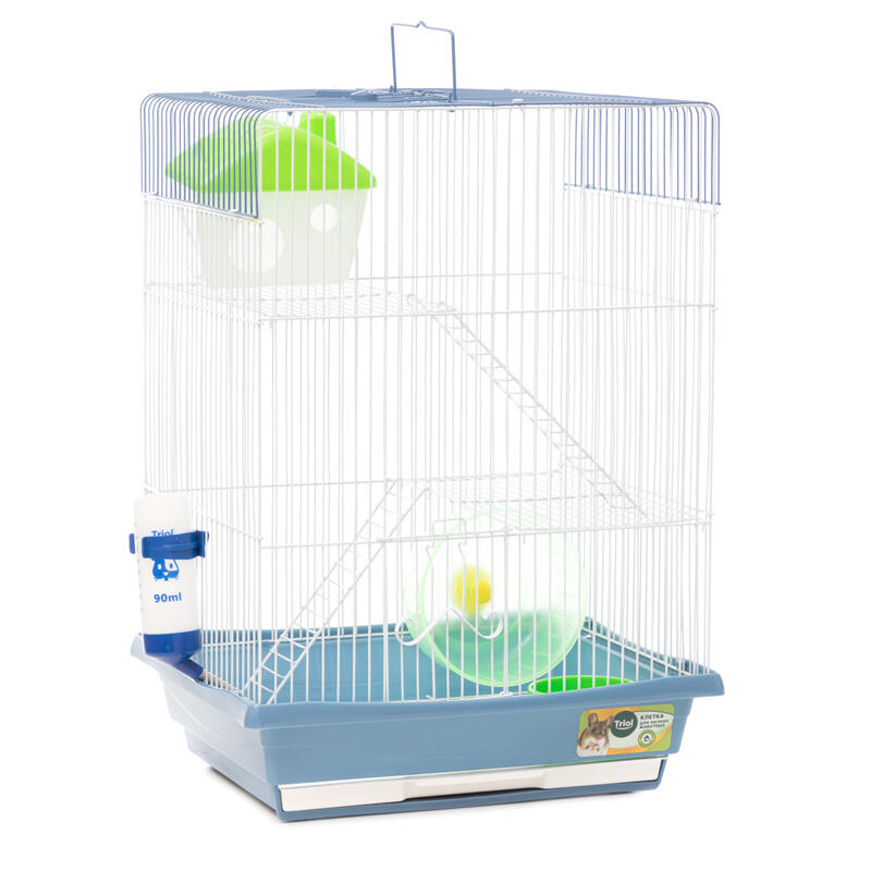 Клетка с прочным металлическим каркасом подходит для мелких домашних животных вроде крыс, мышей и хомяков. Дополнительные аксессуары: пластиковая миска, домик, поилка с носиком и беговое колесо. Клетка оборудована специальным пластиковым наружным поддоном, облегчающим процесс уборки.